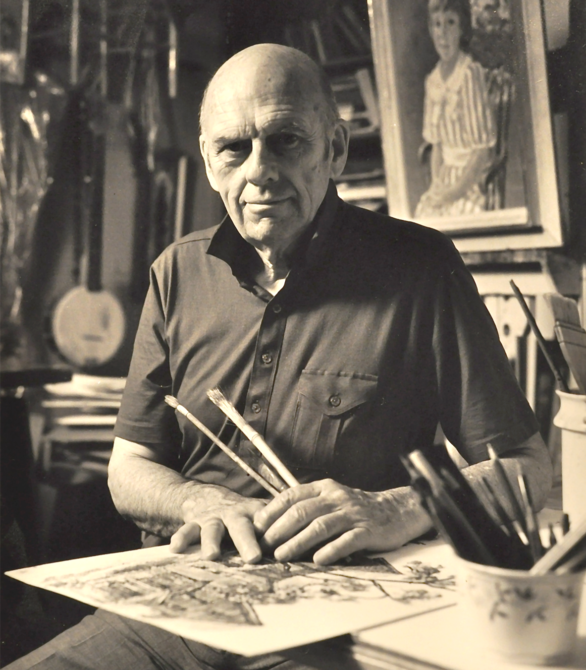 Born in Rochester, he showed early promise — designing a magazine cover at 16 and later studying at Phillips Exeter, East High, and the University of Pennsylvania, where he created stage designs for the Mask and Wig Club. In the 1930s he produced portraits for local publications, discovered lithography under master Bolton Brown, and soon exhibited at the Los Angeles Museum of Art, Albright Art Gallery, and the 1939 New York World’s Fair.